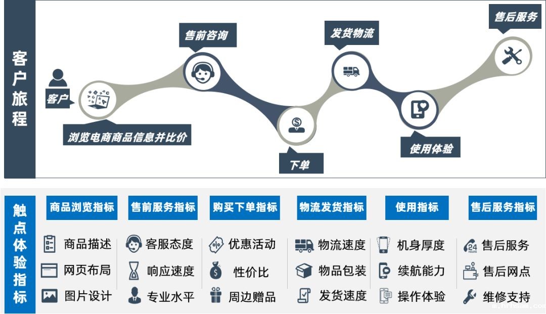 以手机举例,一个客户在网上买智能手机整个流程可以分成七个关键节点,每个关键节点都将在互联网上产生大量的客户体验数据。