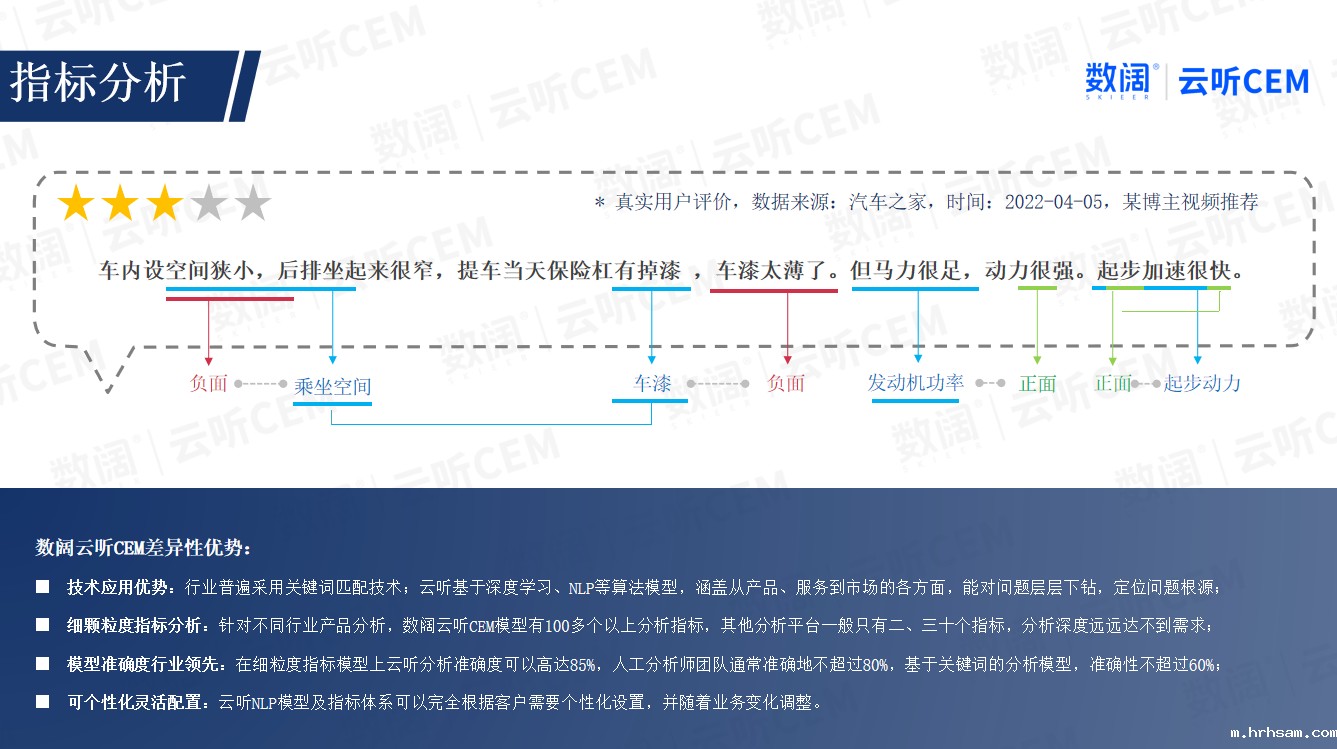 分析的维度决定了数据应用的场景:比如车企可能发现,西部地区的消费者主要对“保养服务”表示不满,车企需与经销商沟通服务提升;XX5车型的“方向盘异响”问题亟待改善;竞品A的“舒适度”要优于本品等……。