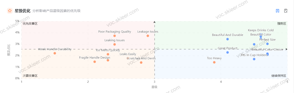taptap亚洲VOC报告的波士顿矩阵图“综合建议”版块显示,Staniey保温杯的保温性(符合海外消费者喜爱冰水的习惯)、便于车内及户外等场景使用的特征,是其突出优势;而其漏水问题则是优先需要改善的点