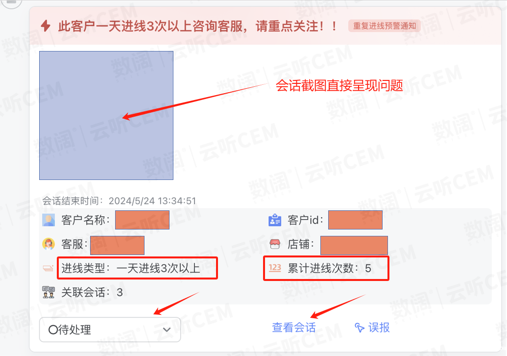 2、实时:对各平台客服会话进行实时风险预警+重复进线预警,最快5分钟内预警到群;