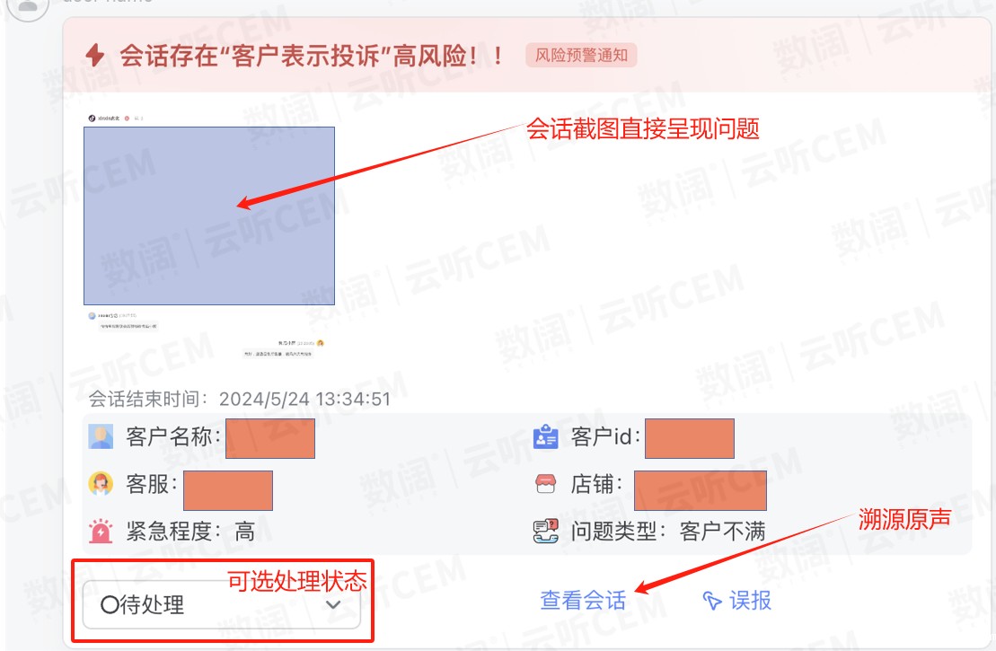在风险预警机制下,云听通过监测咨询标签、质检规则、违禁词、客户情感,各类型潜在客户投诉风险能被快速识别,并将对应的会话原声以截图形式自动推送到对应工作群,提醒关联人员快速响应和处理