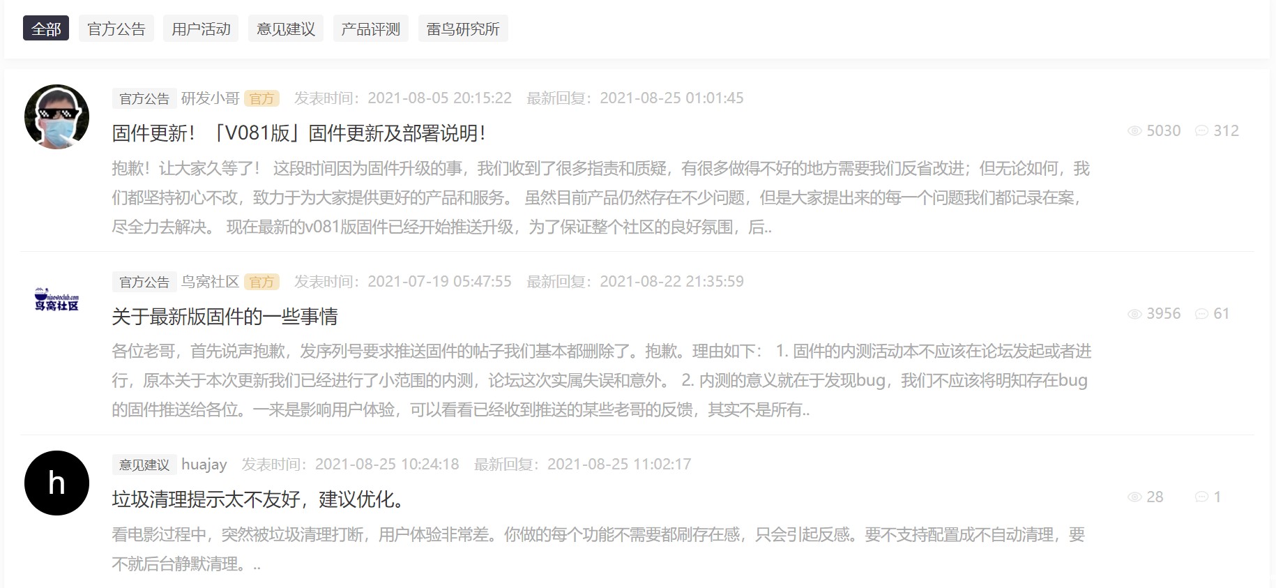 据了解,雷鸟一直将售前、售中、售后这些不同阶段的用户声音搜集起来,以倒逼极致的产品和服务。例如雷鸟的官方论坛“鸟窝社区”、每年520粉丝节、种子用户群、追光者和守夜人计划等,都是其搜集用户体验的途径,即使有些问题不是当下就能立马解决的,但雷鸟会持续推动解决。