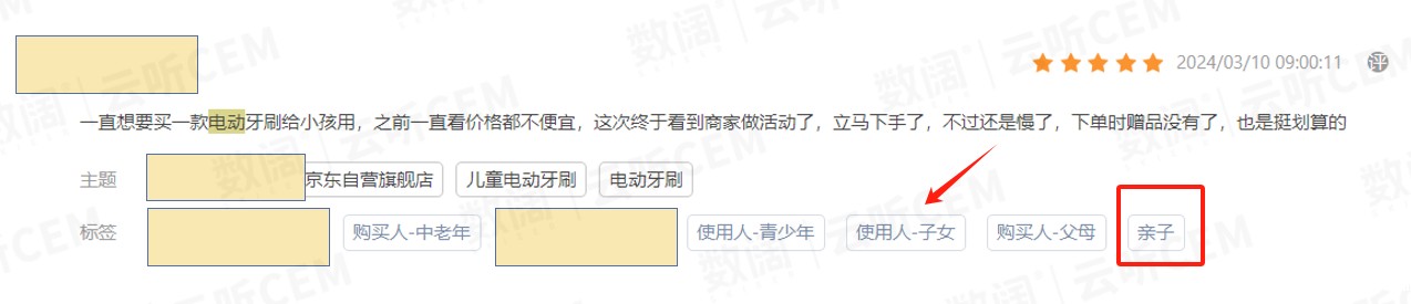 对消费者评论的购买和使用场景标签分析显示,为子女购买和为父母购买的消费场景占比较大,“购买人-父母”、使用人-子女”、亲子”等相关标签出现频次较高。