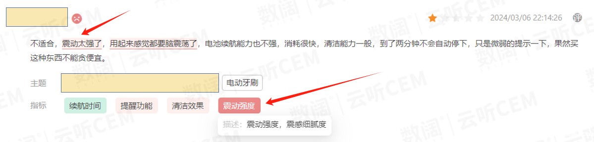 产品维度上,“续航时间”、“震动强度”和“刷头大小”是消费者普遍不满意的3个显著特性。