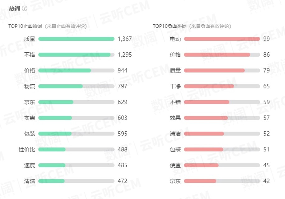TOP10正面热词里,除去“不错”这类模糊热词外,消费者最关注的是“质量”,其次是价格”、“物流”、“实惠,其中包含“质量”热词的评论出现频次最高,达1367条。