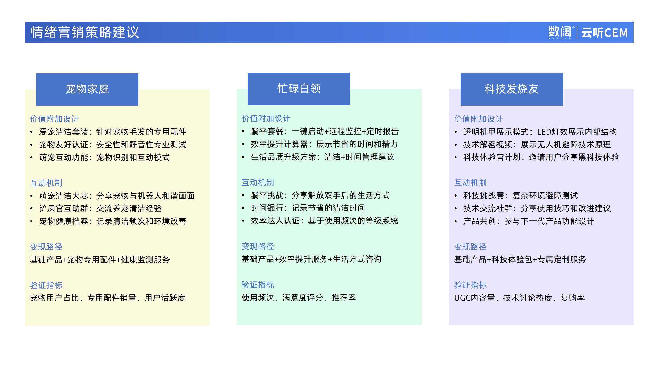 综合来看,短期优先解决体验痛点,中期依托推荐裂变扩大声量,长期可以通过“科技美学”定位+技术开放平台构建壁垒,最终实现从“扫地机器人”到“智能生活方式代言人”的升级。