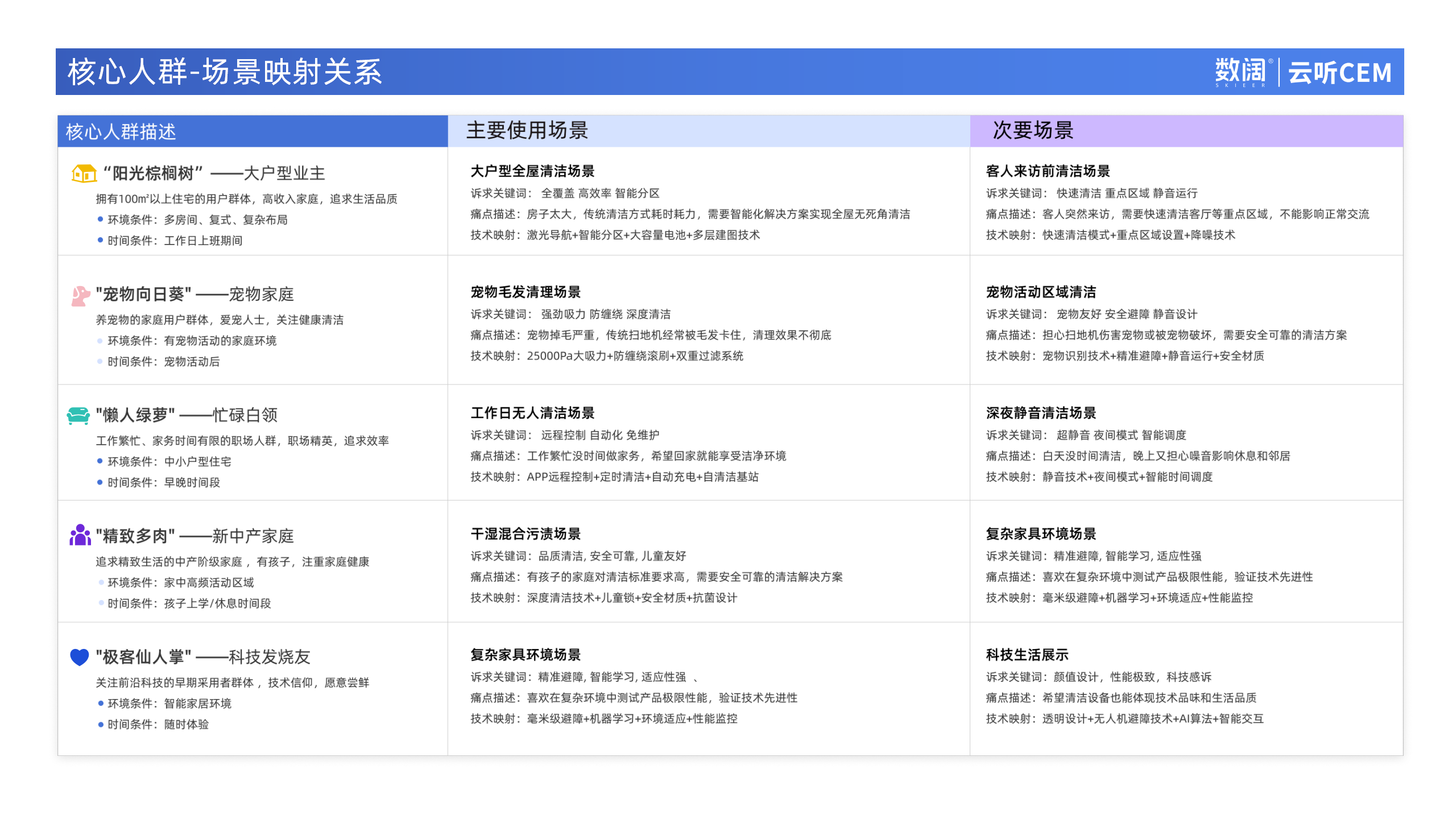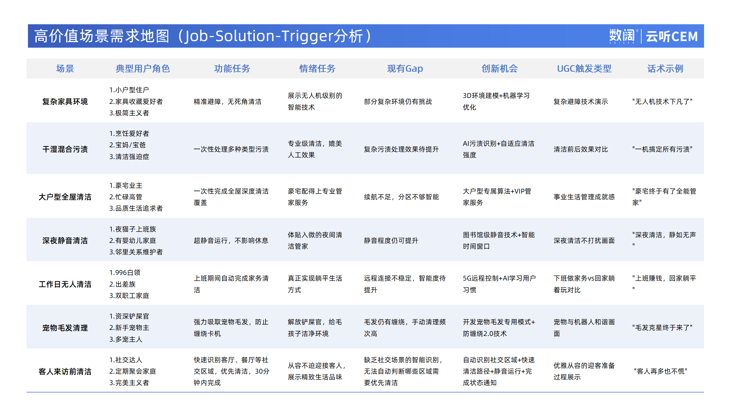 此外,用户需求不仅限于功能满足,情绪价值的结合也需要深化:为客人来访场景开发“快速静音+重点区域优先”功能,为大户型提供专属清洁算法与VIP服务;既解决毛发防缠绕、AI污渍识别等功能痛点,也可以通过场景化设计呼应情绪需求。