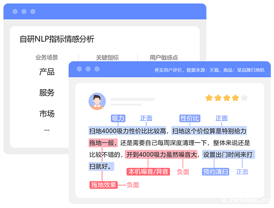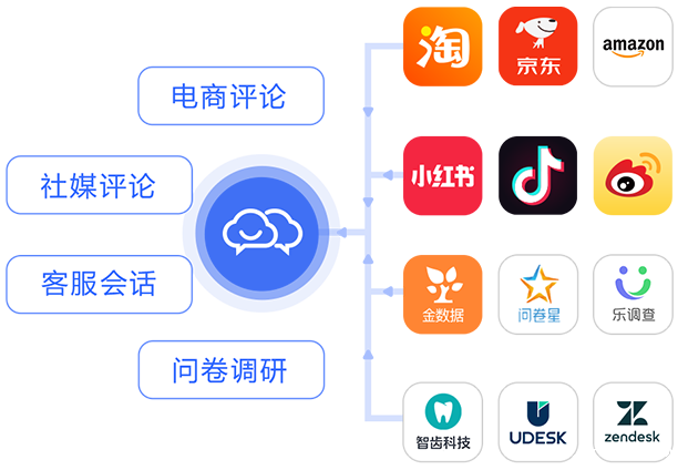 NLP智能算法分析评论情感正负向,提取典型意见 覆盖300+消费品类,分析指标3000+,准确度85%+ 支持NPS分析、满意度分析、文本分析、问卷分析等
