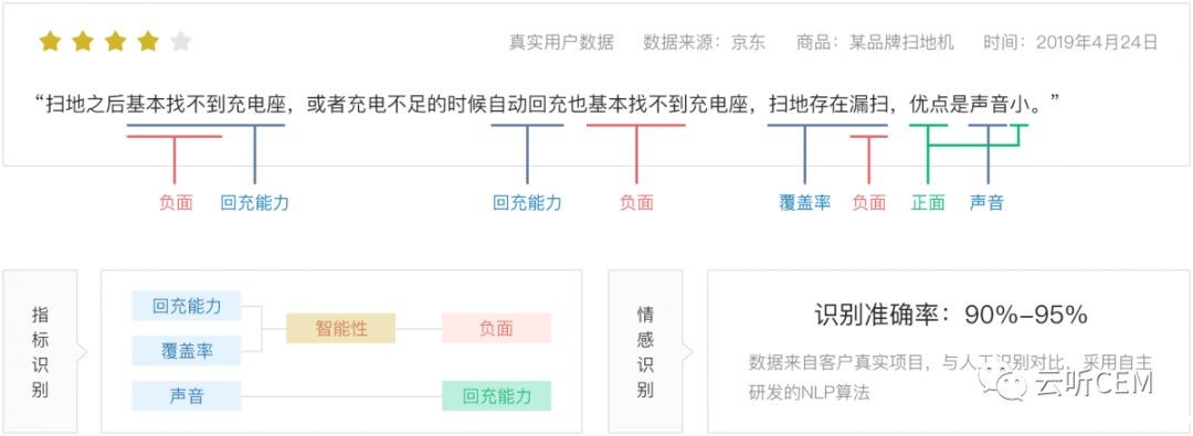 如图所示,taptap亚洲云听CEM的NLP技术能够对客户的一句评价文本,根据为科沃斯量身搭建的365°细粒度数据指标体系进行一一划分,提取典型意见,并且判断其情感正负面倾向。