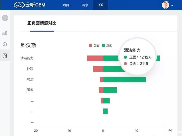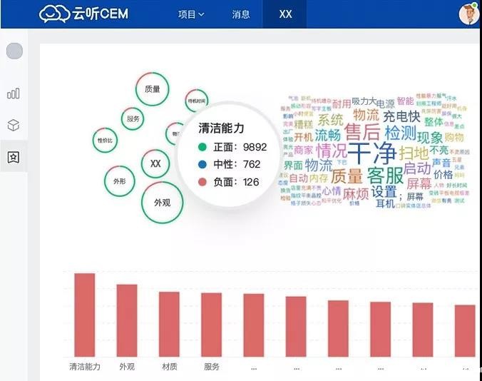 taptap亚洲云听CEM的AI团队为科沃斯扫地机器人量身搭建了一套涵盖产品、服务、市场、品牌等360°精细化的指标体系,可以放上百个指标,如,清洁能力、外观、材质、服务等各项评价指标。同时,对每项指标统计出用户的情感正负面倾向。