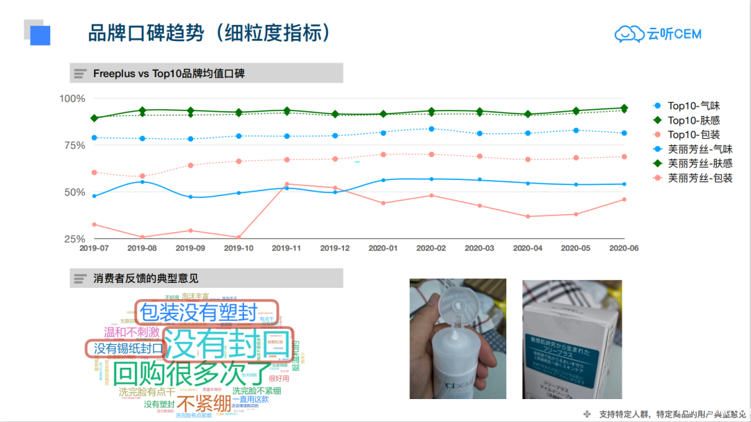 对细粒度指标进一步下钻,把握Freeplus和Top10的品牌口碑走势,了解消费者的典型意见(核心关注点),为产品迭代提供决策建议。