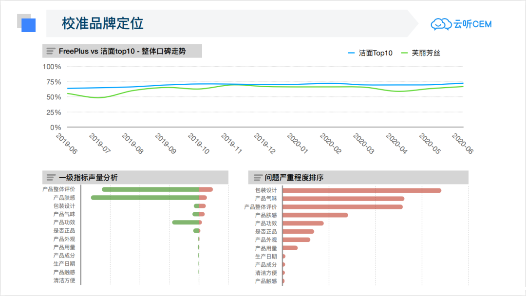 通过Freeplus和销量Top10产品的电商评论分析,从产品、市场、服务等全方位比较Freeplus和销量Top10的指标表现,快速发现Freeplus与Top10口碑均值存在哪些差距,帮助Freeplus品牌精准校准品牌定位。