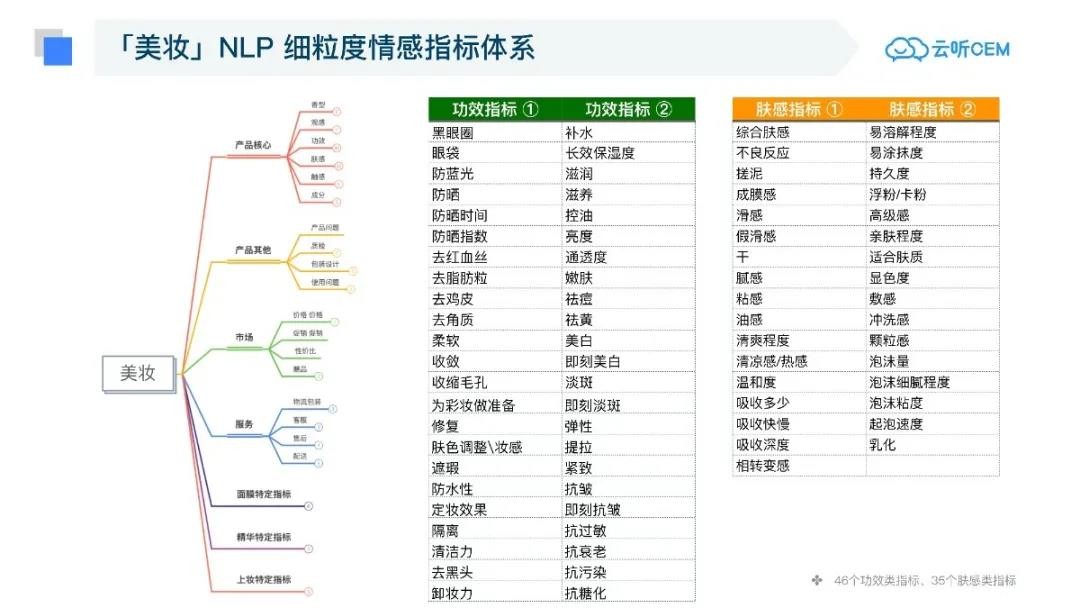 云听将美妆产品情感指标体系细分成46类功能指标,35个肤感类指标,全方面评估美妆产品体验。