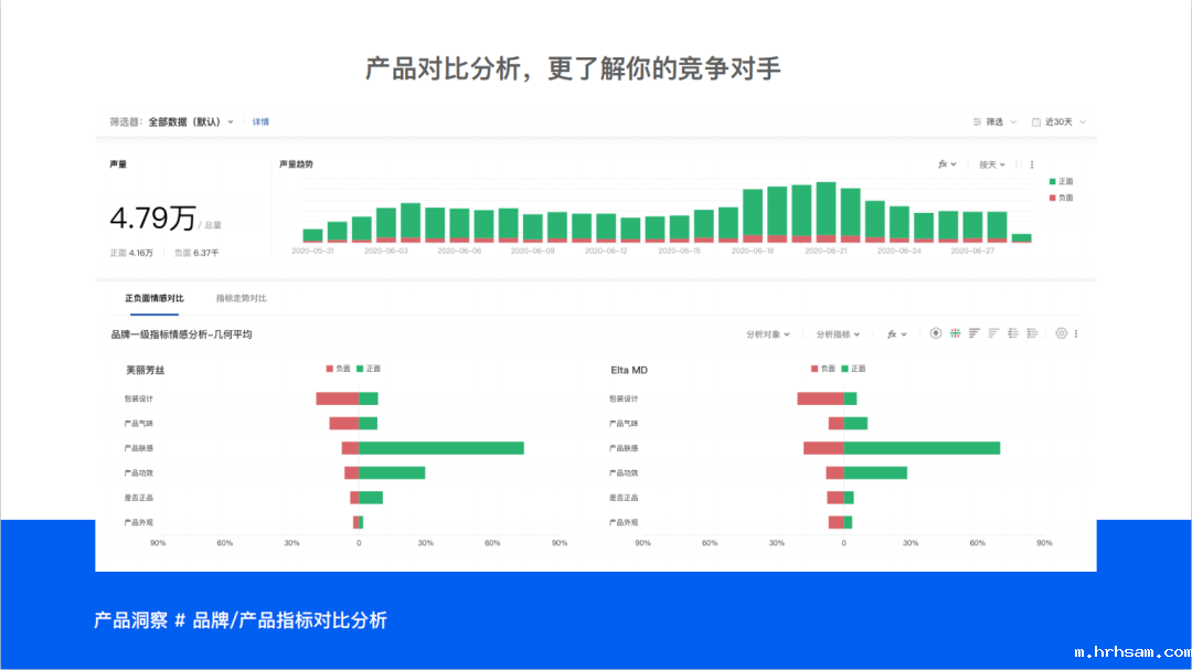 直接竞品指标对比。将同为面向女性敏感肌、且主成分为氨基酸的洗面奶的Freeplus和Elta MD的各项指标进行一一对比,帮助品牌快速了解两家指标的表现差异以及优劣势比较。