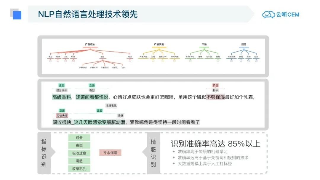 云听将美妆电商的指标拆分成多级指标,通过NLP自然语言处理,对海量美妆商品评论进行自动情感识别,识别精准度高达85%以上,其效率和准确率远高于人工处理。