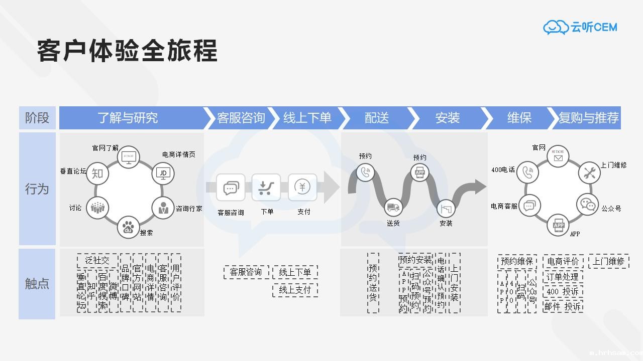 我们以用户视角来作一次客户旅程分解,可以看到,从品牌全渠道营销、推广开始被用户所知,到用户进行产品研究对比,到客服咨询答疑,接着下单、配送、维保环节,全链路用户一直与品牌方保持行为互动及体验反馈。