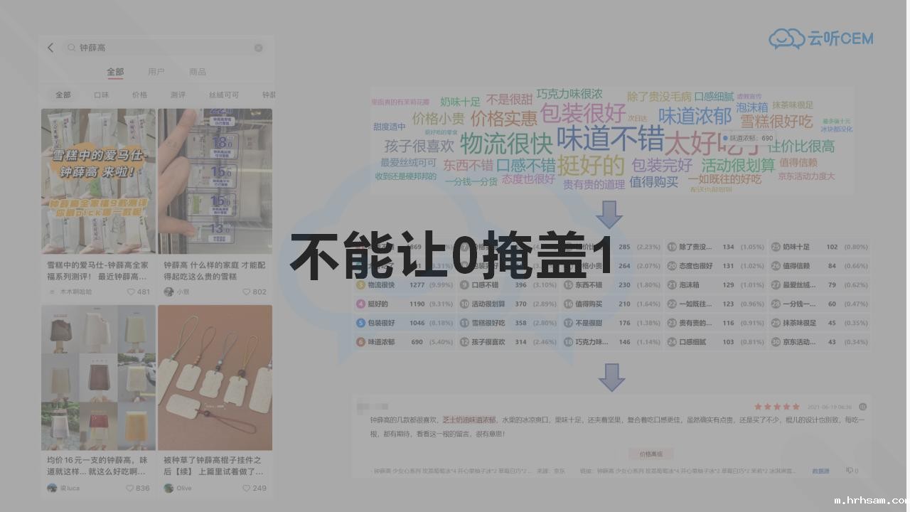 下面和大家分享一张图。左边是最近火爆的钟薛高全网种草的营销内容,经过KOL、KOC的精心包装推广,吸引了大量消费者的关注;右边则是通过我们云听CEM的系统,把这个品牌在全网的所有用户评价的反馈数据搜集过来后,经过智能分析,提炼出来的一些核心观点。