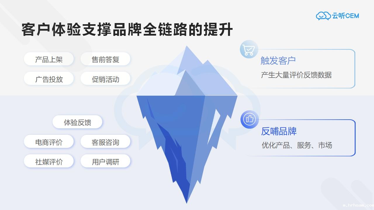 云听CEM客户体验管理平台主要通过全渠道、全用户旅程触点采集消费者对品牌产品、服务、市场等方面的反馈信息,再基于人工智能NLP语义分析,挖掘出用户真实诉求和观点,将客户反馈转化为企业的行动改善意见,落实到产品、服务、市场、运营等各部门,从而推动企业进行产品、服务改善和品类细分创新,提升全旅程消费者口碑与客户体验,帮助品牌实现持续增长。